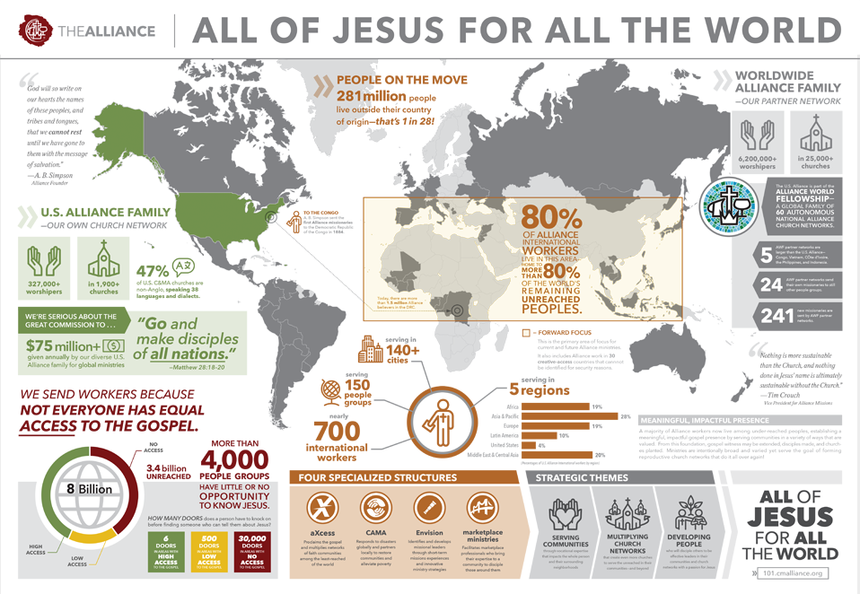 The Alliance Brochure is a six-panel brochure with a fold-out infographic map that presents an overview of The Christian and Missionary Alliance.